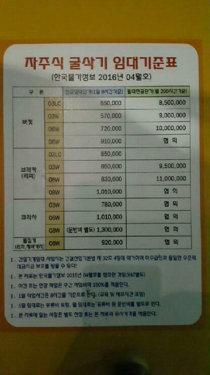 2016년 수도권 자주식(타이어) 굴삭기 임대료 인상 단가표